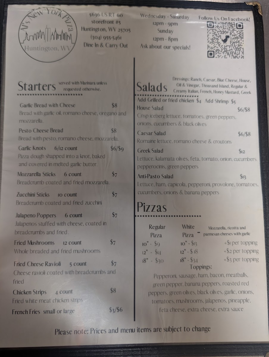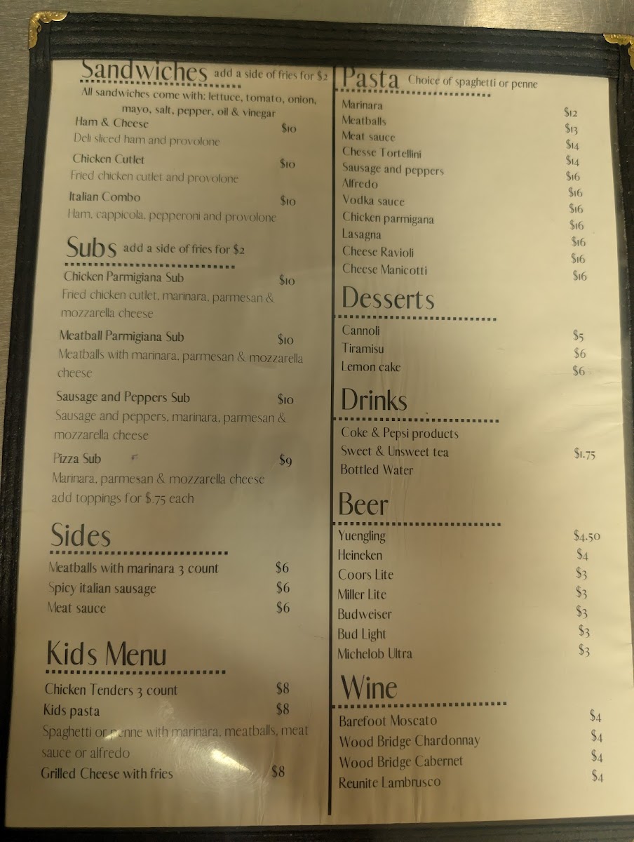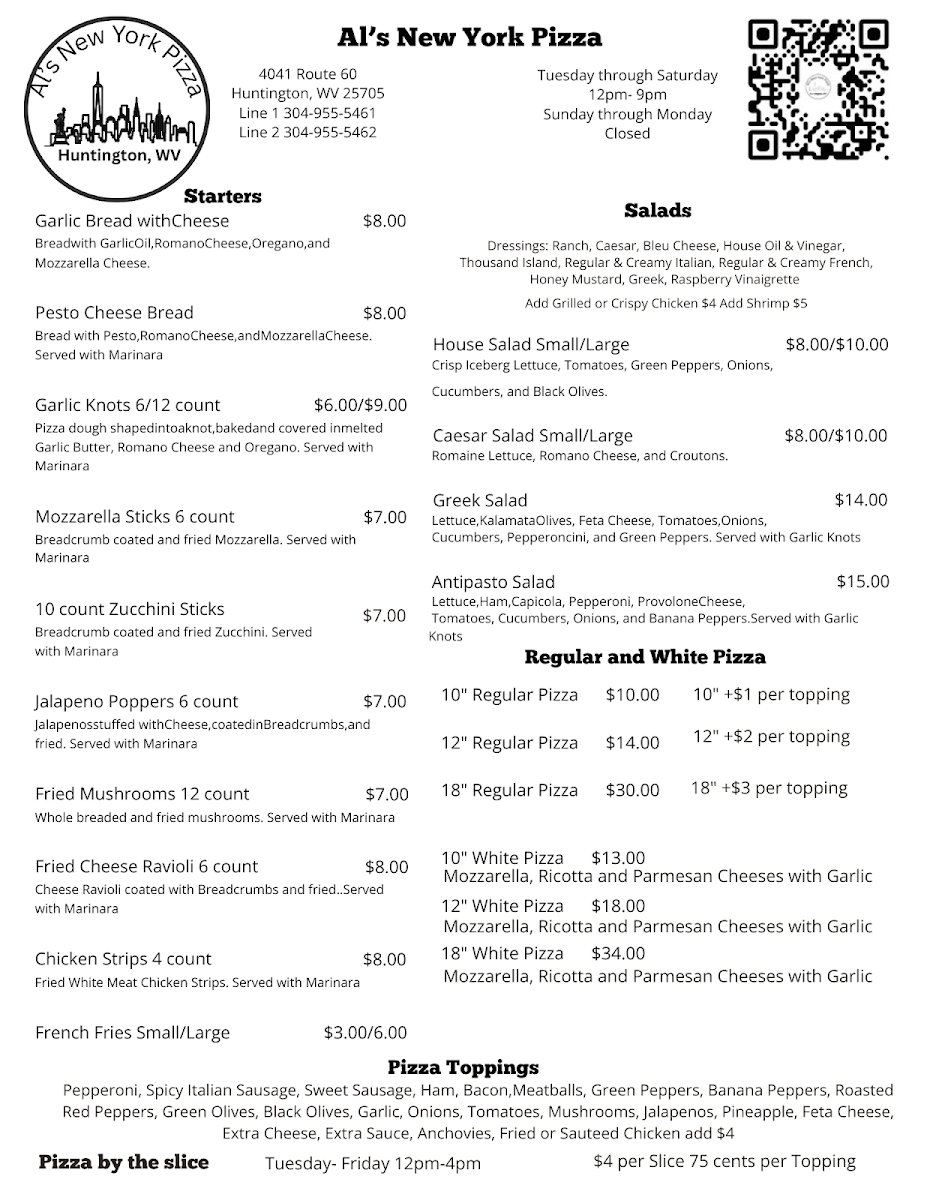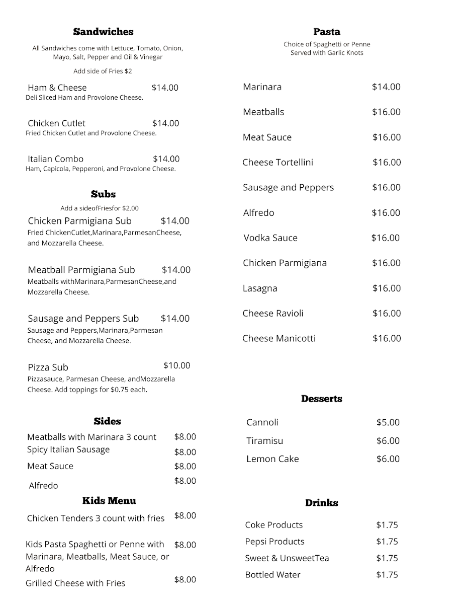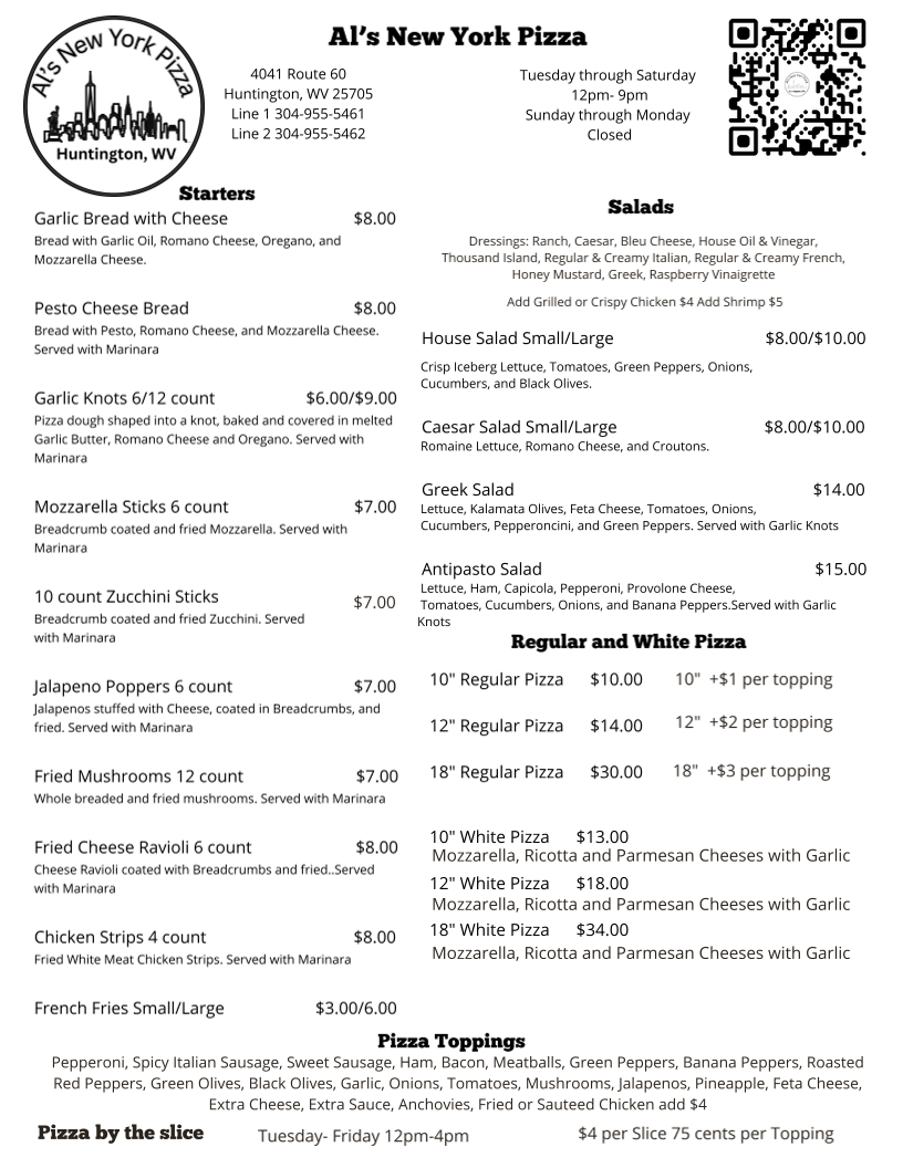 From a reviewer’s perspective, the menu at Al's New York Pizza delivers a well-rounded snapshot of classic Italian-American comfort food, balancing simplicity with crowd-pleasing variety. The lineup begins with fresh House Salad, Greek Salad, and Anti-Pasto Salad, setting a light and flavorful tone. Hearty handhelds like the Ham & Cheese, Chicken Cutlet, and Italian Combo sandwiches offer satisfying options for lunch or a quick bite. Pasta lovers can settle into familiar favorites such as Marinara, Meatballs, Meat Sauce, Cheese Tortellini, and Sausage And Peppers, each reflecting traditional, no-frills Italian cooking. Subs elevate those flavors further with choices like Chicken Parmigiana Sub, Meatball Parmigiana Sub, Sausage And Peppers Sub, and Pizza Sub, all designed for big appetites. To round out the experience, classic desserts-Cannoli, Tiramisu, and Lemon Cake-provide a sweet finish, while drinks range from Coke & Pepsi Products and Sweet & Unsweet Tea to Bottled Water. The sides menu, featuring Meatballs With Marinara 3 Count, Spicy Italian Sausage, and Meat Sauce, adds extra comfort, complemented by shareable starters like Garlic Bread With Cheese, Pesto Cheese Bread, Garlic Knots, Mozzarella Sticks, and Zucchini Sticks. Beverage selections extend to beers such as Yuengling, Heineken, Coors Lite, Miller Lite, and Budweiser, alongside wines like Barefoot Moscato, Wood Bridge Chardonnay, Wood Bridge Cabernet, and Reunite Lambrusco. Even families are covered with a thoughtful kids menu including Chicken Tenders 3 Count, Kids Pasta, and Grilled Cheese With Fries. Overall, the menu feels approachable, generous, and rooted in tradition-exactly what you’d expect from a neighborhood New York-style pizza spot aiming to please every table.